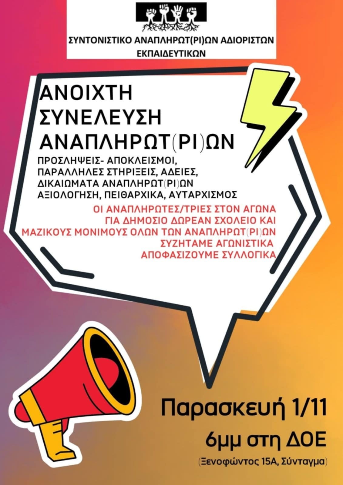 ΑΝΟΙΧΤΗ ΣΥΝΕΛΕΥΣΗ ΑΝΑΠΛΗΡΩΤΩΝ ΠΑΡΑΣΚΕΥΗ 1/11/2024, 6ΜΜ, ΣΤΗ ΔΟΕ 30 Οκτωβρίου, 2024 admin ΠΑΡΑΤΑΞΕΙΣ 0 Views: 6 ΠΑΡΕΜΒΑΣΕΙΣ ΚΙΝΗΣΕΙΣ ΣΥΣΠΕΙΡΩΣΕΙΣ Π.Ε