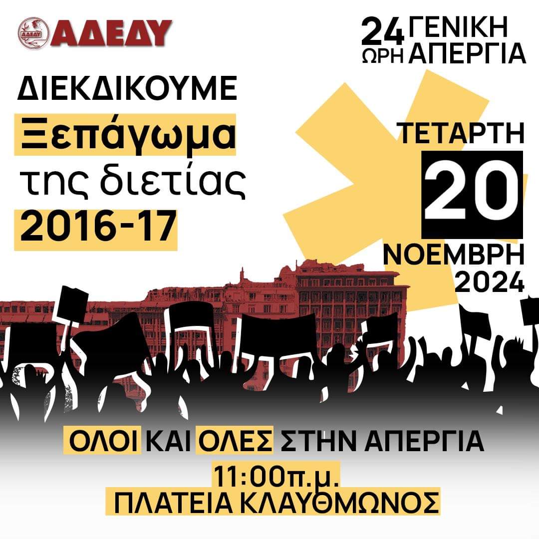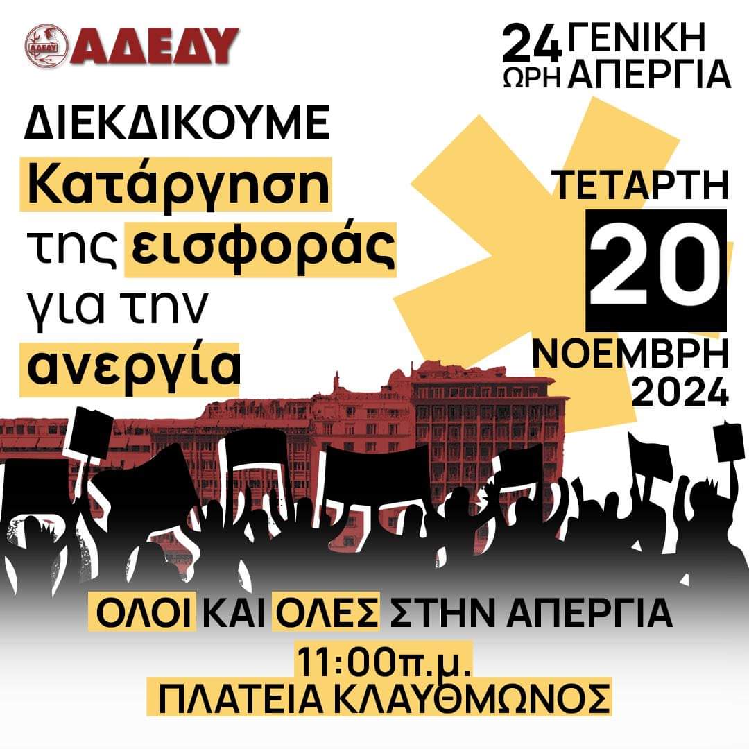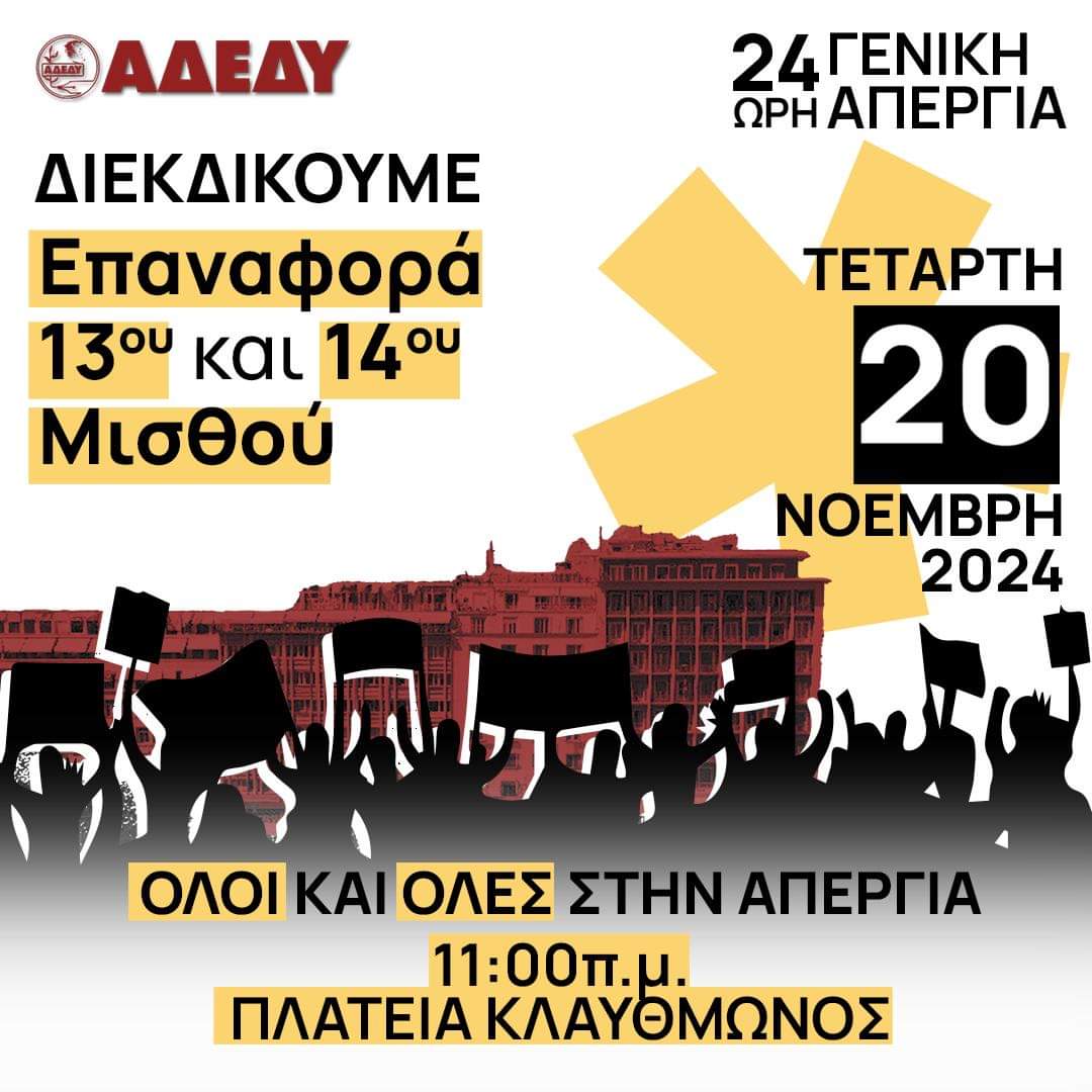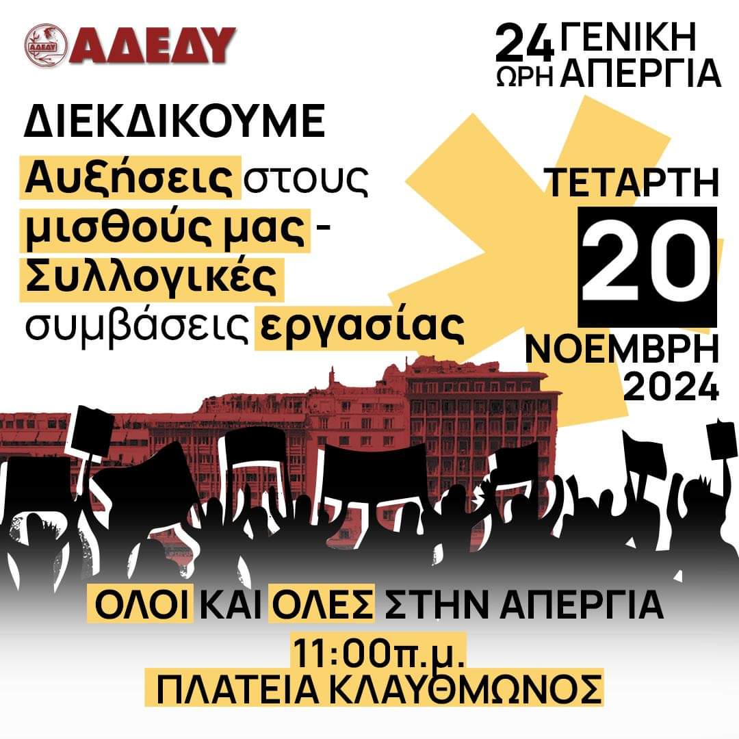 Η Εκτελεστική Επιτροπή της Α.Δ.Ε.Δ.Υ., υλοποιώντας απόφαση του Γενικού Συμβουλίου, κηρύσσει 24ωρη Γενική Απεργία την Τετάρτη, 20 Νοεμβρίου 2024, από κοινού με τους εργαζόμενους του Ιδιωτικού Τομέα,