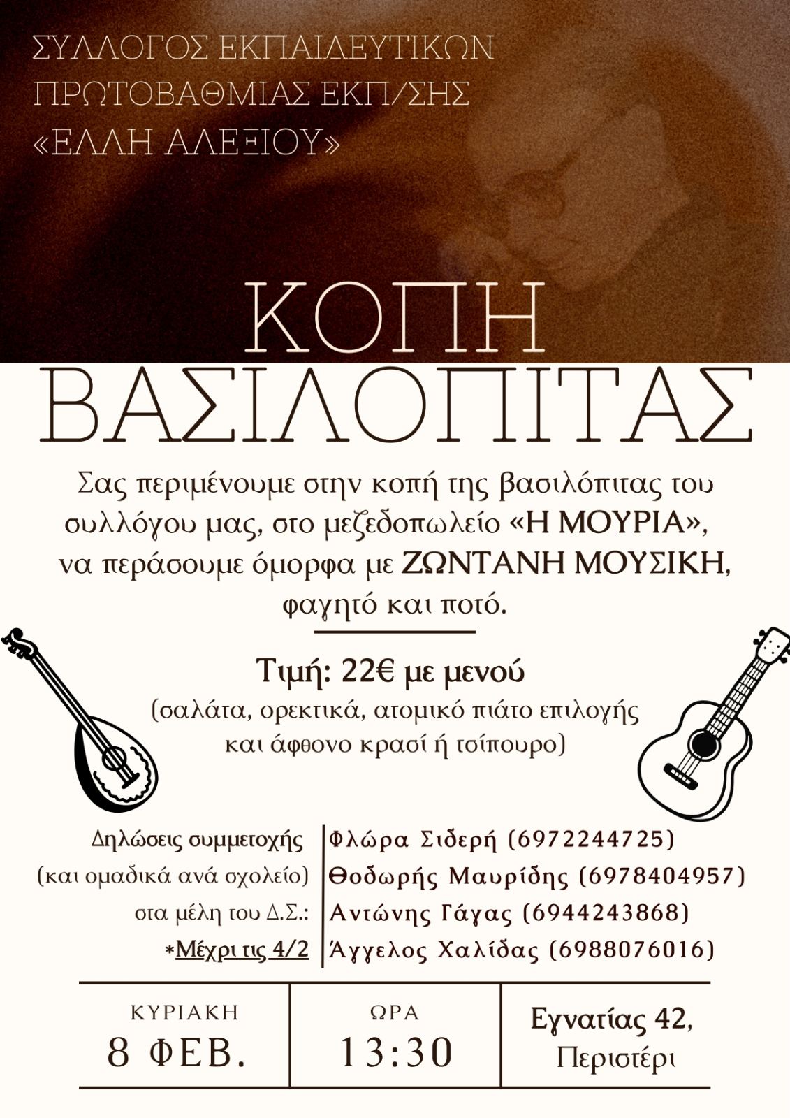 Το Δ.Σ. του Συλλόγου Εκπαιδευτικών Π.Ε. Περιστερίου «Έλλη Αλεξίου» σας προσκαλεί στην ετήσια κοπή πίτας του Συλλόγου