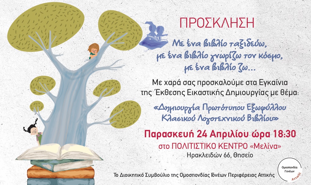 Σας καλούμε να παρευρεθείτε στα εγκαίνια της την Παρασκευή 24 Απριλίου, στις 18:30 το απόγευμα, στο Πολιτιστικό Κέντρο “Μελίνα” στο Θησείο.